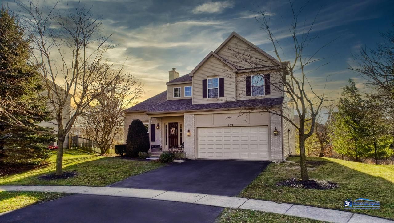 View our 3D virtual tour above. Welcome to 603 Brooking Ct. in sought after Painted Lakes Subdivision on quiet cut-de-sac. Grand entry with open floor plan. Formal living & dining room. Spacious kitchen with island has ample cabinets & huge pantry. Kitchen opens to large family room with fireplace. French doors off kitchen lead to large deck overlooking nature. Master bedroom has separate walk-in his & her closets. Master bath with double sinks, separate shower & tub. Spacious finished walkout basement has wet bar, fireplace, full bath and lots of storage. 9' ceilings on main floor & basement. New roof, garage door, gutters & siding on front and south side of home in 2018. 2-car garage with additional storage space. Enjoy Sun Lake Forest Preserve's 3.5 mile walking, jogging &/or biking path with awesome nature sites, plus 2 parks in the neighborhood. Oakland & Lakes High School down the road.